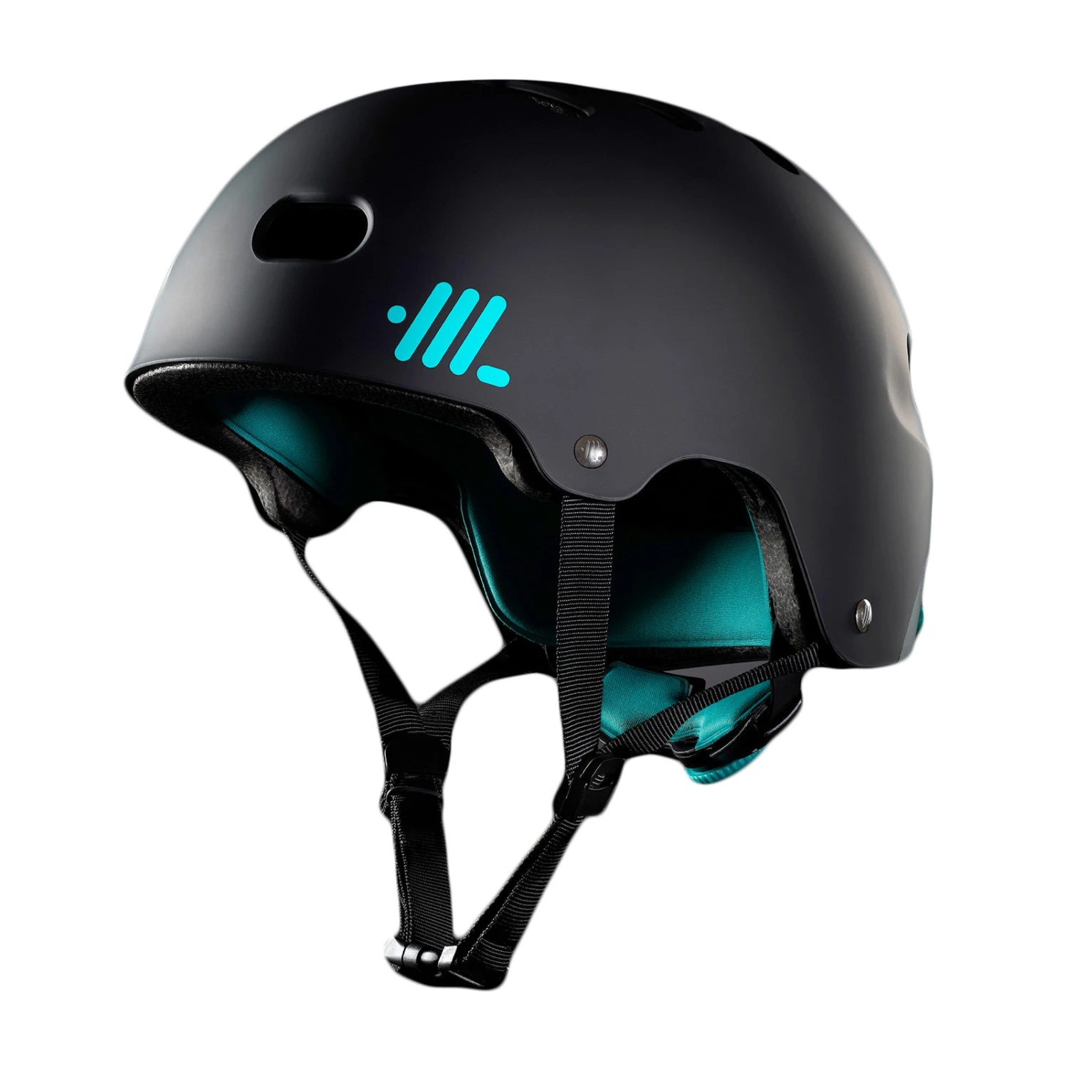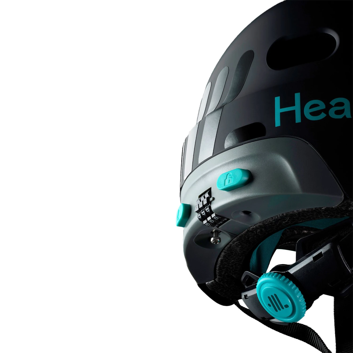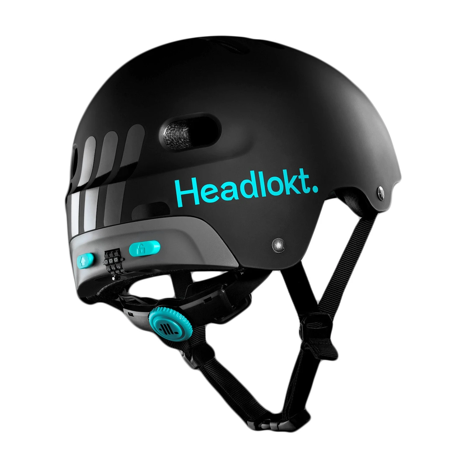 The Headlokt Matte Black helmet, features a sleek Matt Black shell with signature Aqua detailing, and features an integrated retractable cable lock.
